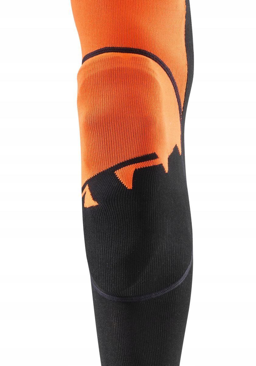 PROTECTOR SOCKS to skarpety do jazdy off-road zintegrowaną ochroną kolan. Posiadają siateczkowe wstawki oraz paski z przyczepnym silikonem. Ochrona kolan jest odpinana. Obszary kompresji i wyściółka na palcach i pięcie zwiększają komfort użytkowania. Te wyjątkowe skarpety są przeznaczone wyłącznie dla KTM i zostały stworzone przez Komperdell. Skład skarpet to 57% poliester, 33% poliamid i 10% elastan.