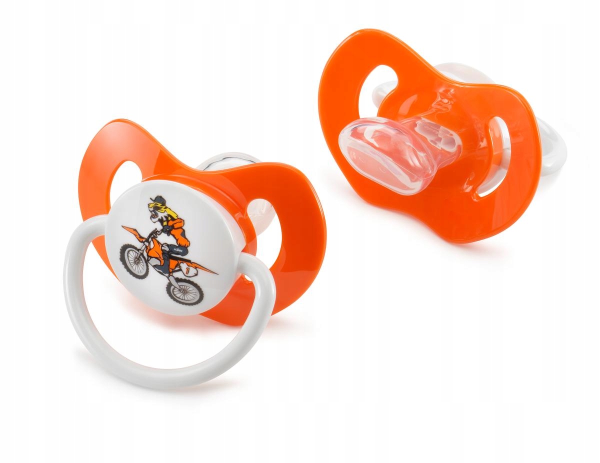 Startuj na prowadzenie z nowym smoczkiem KTM! W naszej KTM Collection Radical, znajdziesz idealne akcesorium dla najmłodszych miłośników marki. Zestaw dwóch smoczków w rozmiarze 2 (od trzech miesięcy) w kolorze pomarańczowym i czarnym, spełniający normy CE, wykonany jest z bezpiecznego dla dzieci 100% silikonu BPA-free. Nie pozwól, aby cokolwiek przeszkodziło twojemu młodemu zawodnikowi w rozwijaniu swoich umiejętności!